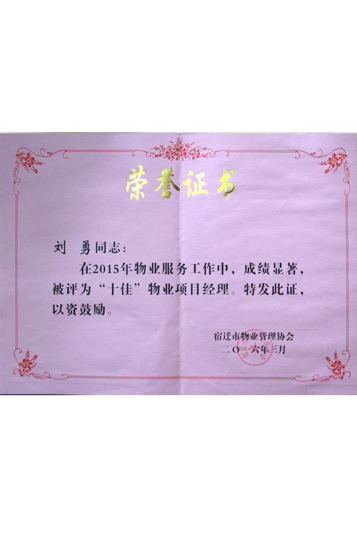 - 十佳項(xiàng)目經(jīng)理劉勇(2016年)